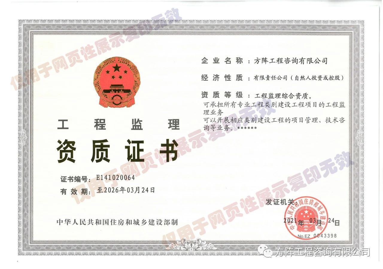 2021年3月24日,方陣工程咨詢有限公司取得工程監(jiān)理行業(yè)最高資質(zhì)--綜合資質(zhì),這是方陣咨詢發(fā)展歷程中具有里程碑意義的日子,從此,方陣咨詢將象人民解放軍陣容威儀的隊(duì)列一樣,步步為